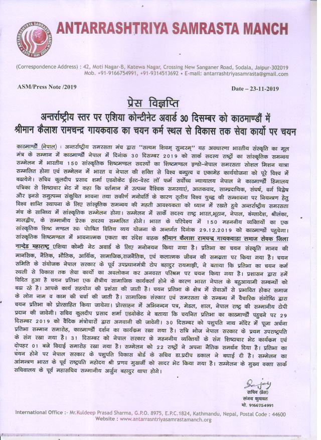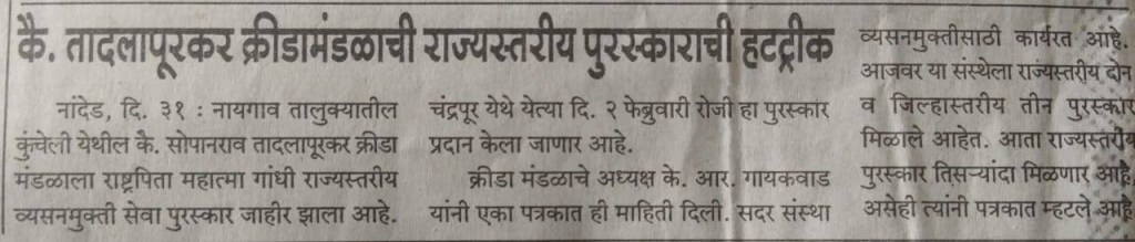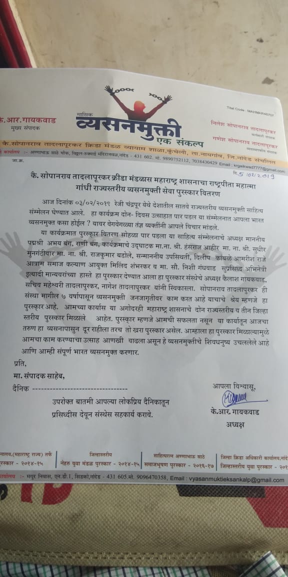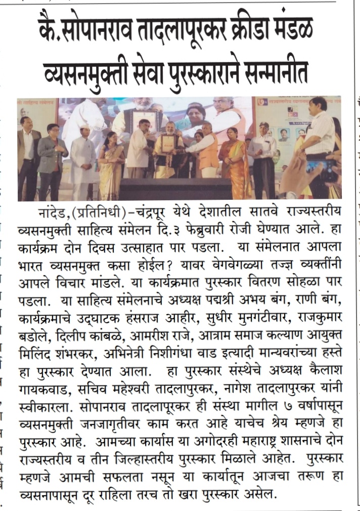 १-०५-२०१८ रोजी संस्थे च्या सचीव माहेश्वरी सोपानराव तादलापुरकर यांचा पालकमंत्री कदम साहेब जिल्हा अधिकारी डोंगरे साहेब यांच्या हस्ते जिल्हास्तरीय पुरस्कार देउन सन्मानित करण्यात आले या कार्यक्रमात संस्थे चे अध्यक्ष कैलाश गायकवाड हे पण उपस्थित होते या पुरस्काराने आम्हाला खूप उर्जा मिळाली या पुढे आम्ही असेच जनजागृती अभियान राबवित राहणार